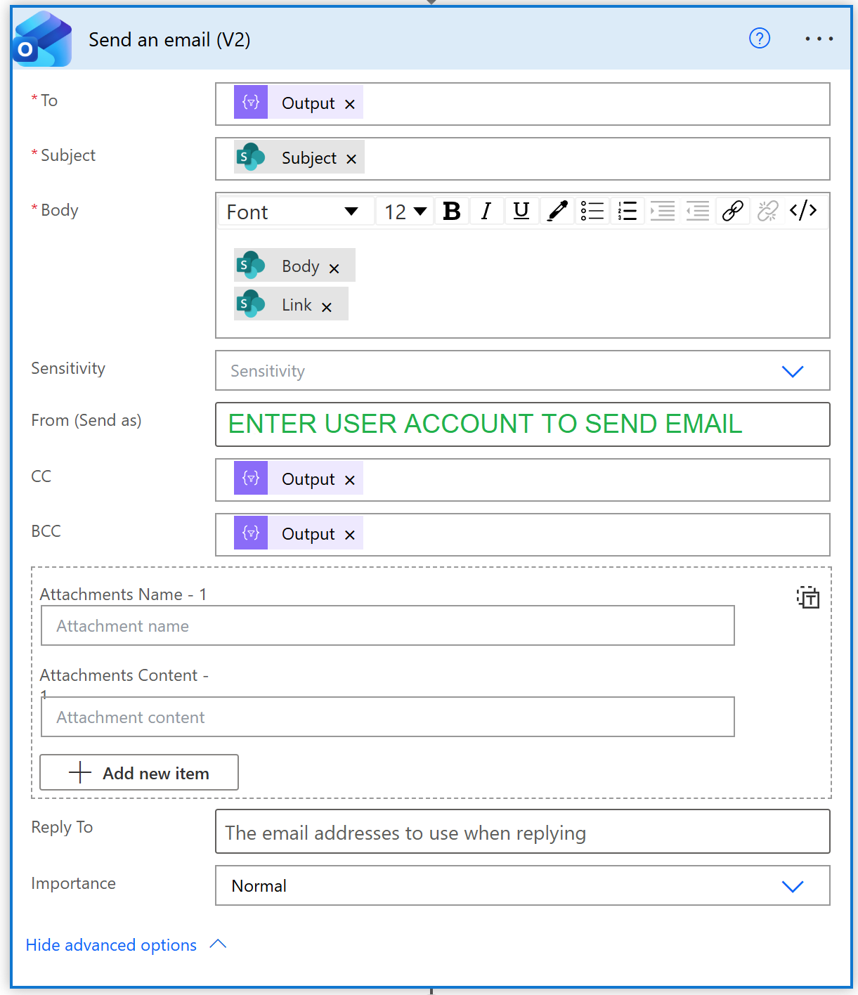 G. At long last, we are ready to send the email. Use the outputs of the Join actions for To, CC and BCC fields. The Subject, Body and Link fields are added where you would expect as shown. For the sender, by default it must be your account, but ideally this should be a "no reply" email user account. If your organization doesn't already have this, you can create a new user in M365 user management and assign an Exchange license to the user so that it can send email. Be sure that YOUR account is added on that account as allowed to send email.