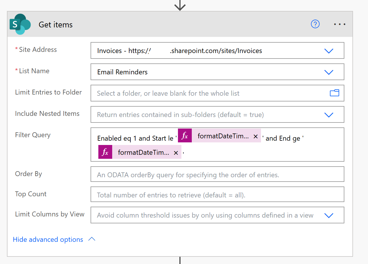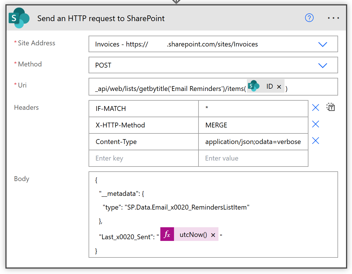 H. There is one final step. We want to update the "Last Sent" field with a date time stamp each time an email goes out for each rule. The cleanest way to do this is via a SharePoint HTTP Request. Note that if you named your list something different than "Email Reminders" you will need to adjust the Uri field and the Body accordingly. Use the code snippets provided.