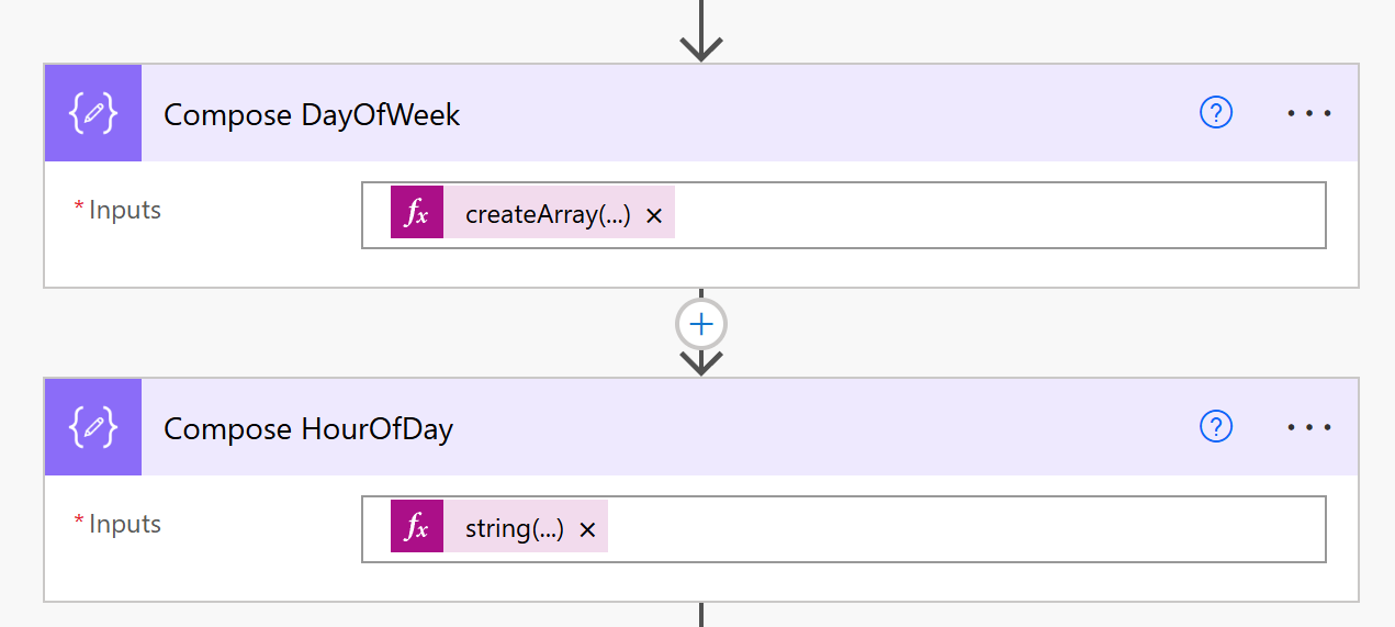 B. Next use two compose actions to get the day of the week and the hour of the day that the workflow runs. Use the code snippets provided.