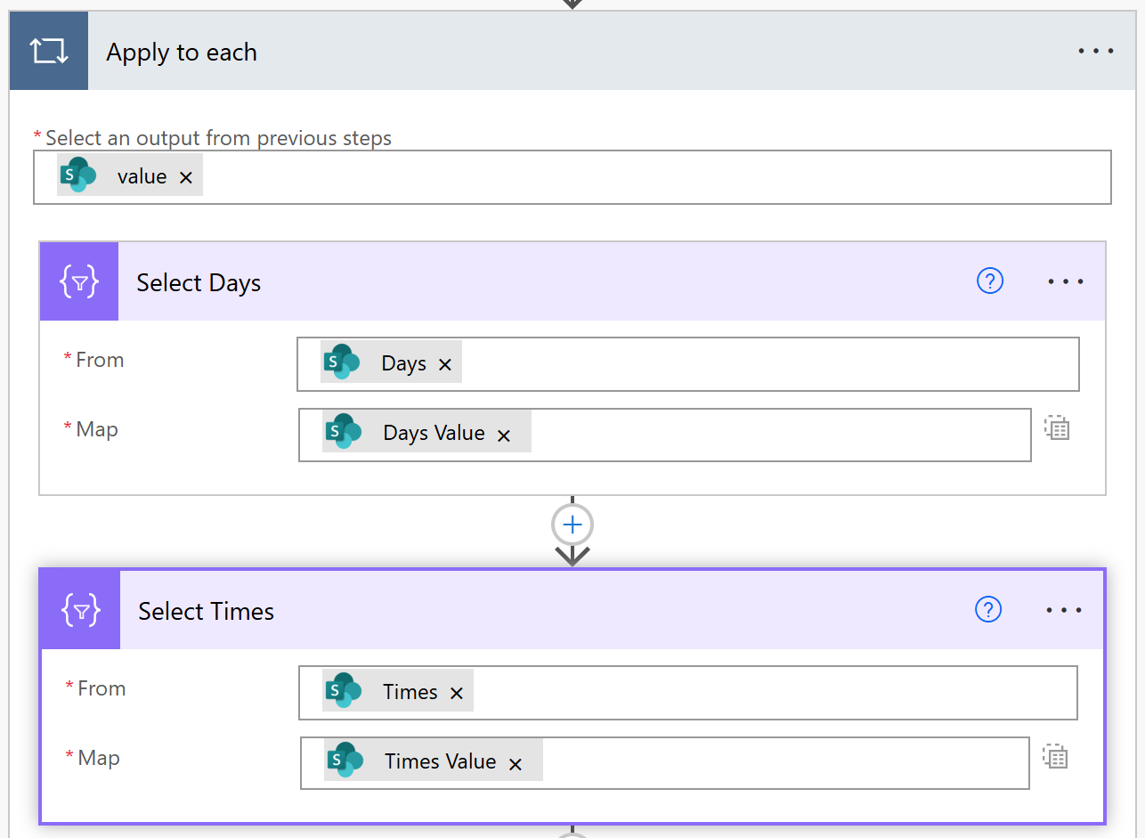 D. Add an Apply to each action and two selects for the days and times. Use the code snippets provided.