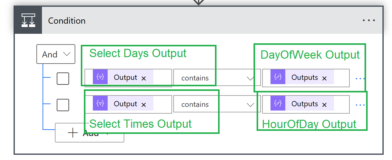 E. Next set up a compound condition to check that the day and time match what is selected in the rule. Carefully select the outputs as indicated using the contains comparison. This will ensure an email is only sent on the selected day(s) and time(s).