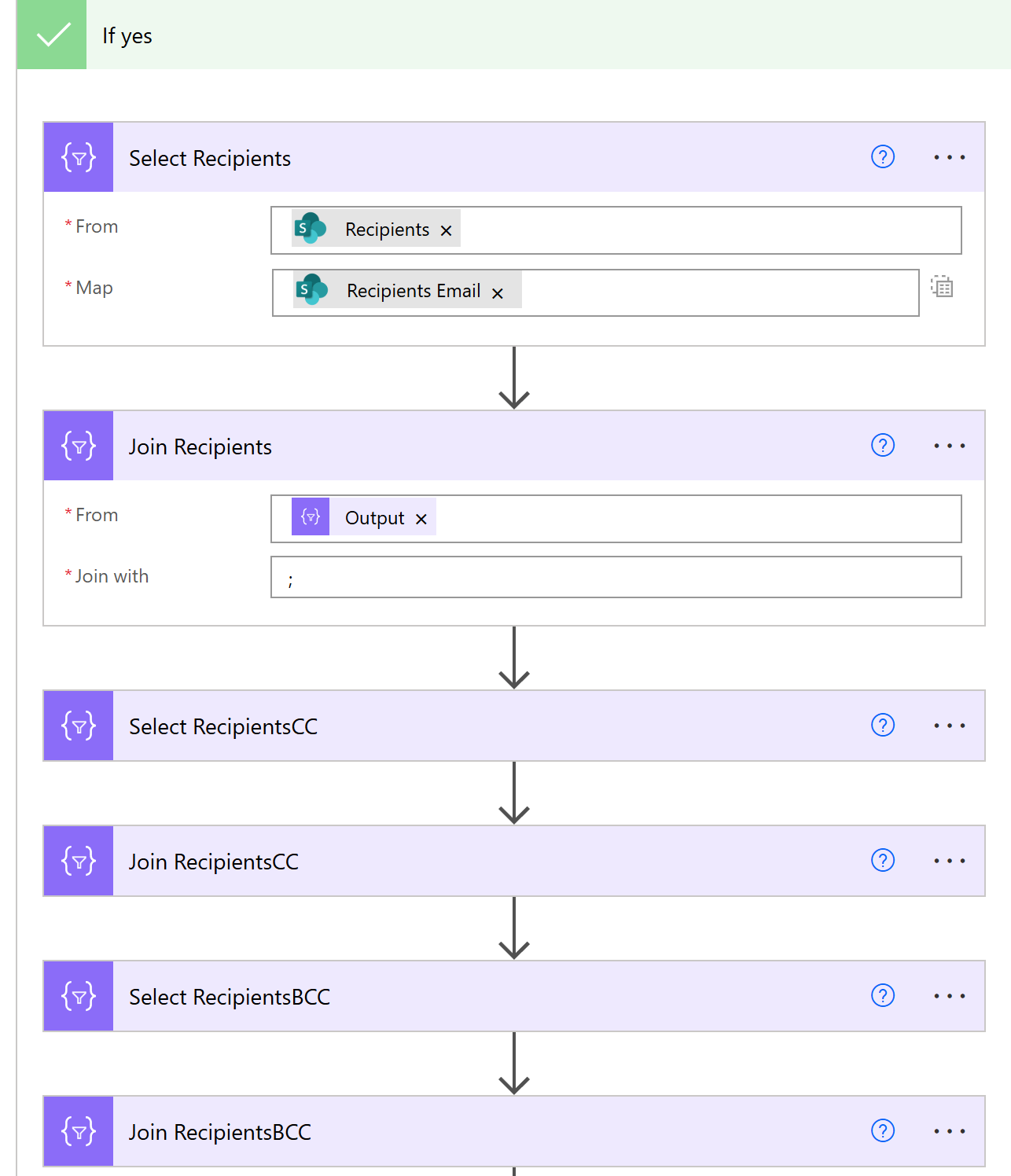 F. In the "Yes" path, we will finish out the Flow. In order to get the email addresses of all users in the multi select person fields, we need to use a Select action and then a join action to get ";" delimited email addresses. Use a pair of actions for each of the 3 person fields "Recipients", "RecipientsCC" and "RecipientsBCC". Use the provided code snippets. Each Join action references the output of the Select immediately above.